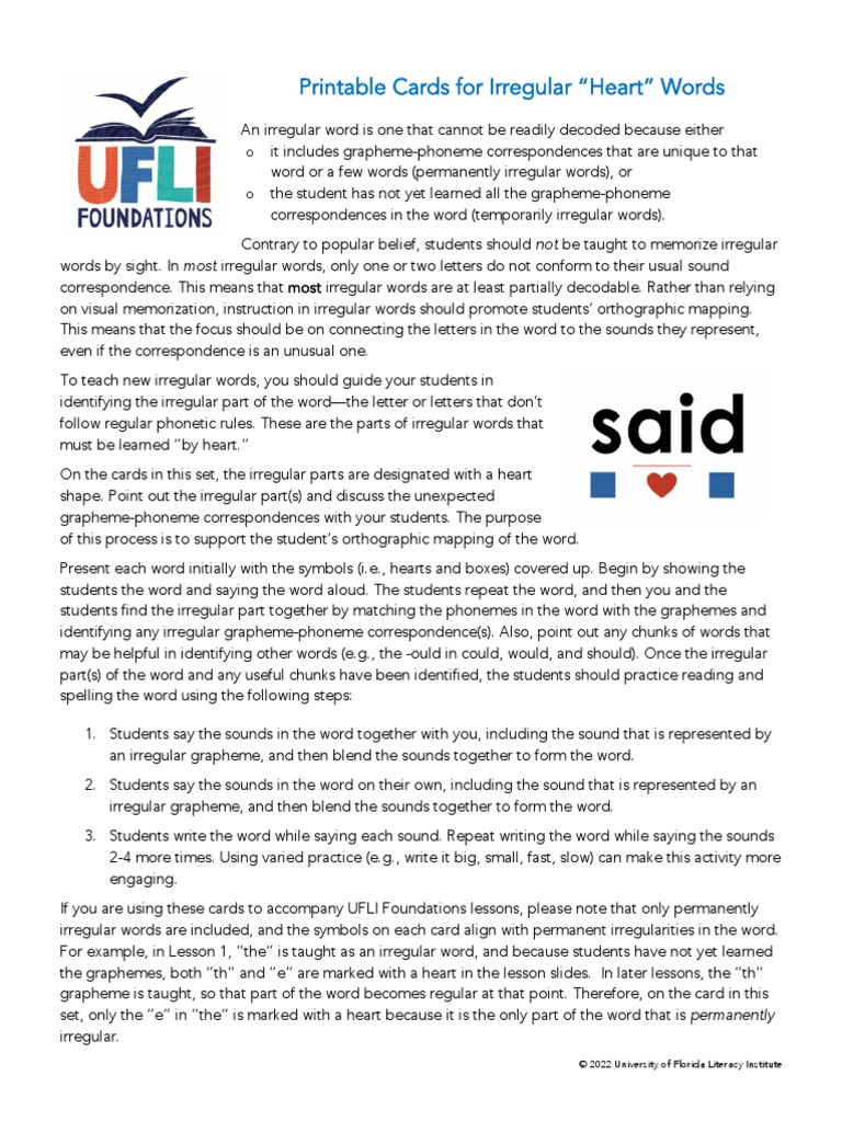 UFLI Heart Word Printable Cards PDF Word Orthography