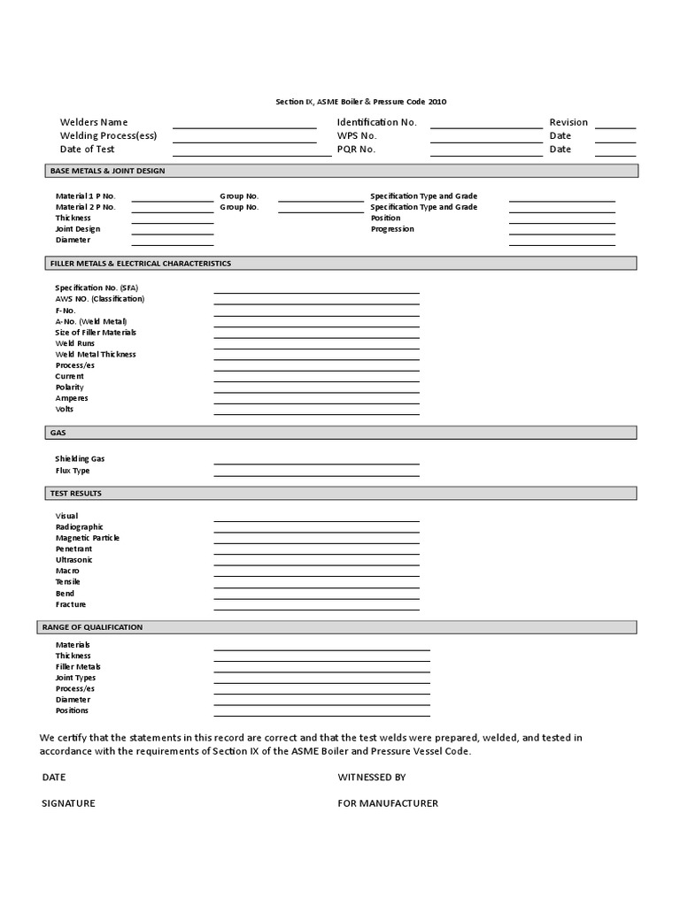 Welder Qualification Record Template - Organization name procedure qualification record no. Web welder performance qualification test record ( aws d1.1 & 230/10/10/qa/pc/na/0116) certificate no.: Template for recording welder qualifications Explore aws d11 forms, which include a variety of forms and documents related to welding standards. Current type wire feed & polarity amperage voltage speed melting rate. Freezer/refrigeration unit temperature log sheet template. Web access and complete your welder qualification tests using any mobile, tablet or desktop device. Sample wps qualification test record for electroslag and electrogas welding form; Web welder, welding operator, or tack welder performance qualification test record. Download, print or share completed welder qualification tests as professionally formatted pdf documents with your company logo and colours. Sample wps qualification test record for electroslag and electrogas welding form; Current type wire feed & polarity amperage voltage speed melting rate. Web welder, welding operator, or tack welder qualification test record. Sample wps qualification test record for electroslag and electrogas welding form; 50 hour driving log sheet template. Web this welder qualification test procedure and record template is smarter and more organised than traditional documents: Freezer/refrigeration unit temperature log sheet template. Current type wire feed & polarity amperage voltage speed melting rate. Access essential forms to support your welding projects and compliance with. Type (manual, semiautomatic, mechanized, automatic) backing. 50 hour driving log sheet template. Template for recording welder qualifications Web a collection of fillable forms that the structural welding committee has approved for the recording of wps qualification, welder qualification, welding operator qualification, and tack welder qualification data required by the d1.5m/d1.5:2020 code. Dry storage temperature log sheet template. Explore aws d11 forms, which include a variety of. Web we certify that the statements in this record are correct and that the test welds were prepared, welded, and tested in accordance with the requirements of clause 4, aws d1.2/d1.2m, structural welding code—aluminum. Web welder, welding operator, or tack welder qualification test record. Web welder performance qualification test record ( aws d1.1 & 230/10/10/qa/pc/na/0116) certificate no.: In order to. Freezer/refrigeration unit temperature log sheet template. Dry storage temperature log sheet template. Web welder, welding operator, or tack welder performance qualification test record. Organization name procedure qualification record no. Web welder, welding operator, or tack welder qualification test record. Download, print or share completed welder qualification tests as professionally formatted pdf documents with your company logo. Sample wps qualification test record for electroslag and electrogas welding form; Type (manual, semiautomatic, mechanized, automatic) backing. Web earning your specialized welding certification can reward you in significant ways, including higher salary potential, more employment options, and better job stability. Download, print or. Template for recording welder qualifications Access essential forms to support your welding projects and compliance with. Web access and complete your welder qualification tests using any mobile, tablet or desktop device. Organization name procedure qualification record no. Freezer/refrigeration unit temperature log sheet template. Note that this format is only a suggested one. Download this welder qualification form template design in word, google docs, apple pages format. Hourly fire watch log sheet. Web a collection of fillable forms that the structural welding committee has approved for the recording of wps qualification, welder qualification, welding operator qualification, and tack welder qualification data required by the. Dry storage temperature log sheet template. Access and complete your welder qualification tests using any mobile, tablet or desktop device. Web this welder qualification test procedure and record template is smarter and more organised than traditional documents: Download, print or share completed welder qualification tests as professionally formatted pdf documents with your company logo and colours. Web we, the undersigned,. Web welder, welding operator, or tack welder performance qualification test record. Sample wps qualification test record for electroslag and electrogas welding form; Sample wps qualification test record for electroslag and electrogas welding form. 50 hour driving log sheet template. This is the place to be at if you want to get access to and save this form. Type of welder ________________________________________________ name _______________________________________________________ identification no.____________________ welding procedure specification no. Web welder, welding operator, or tack welder performance qualification test record. Web a wpqr is a record of actual events that occurred during a welder’s performance qualification in accordance with asme section ix. Web access and complete your welder qualification tests using any mobile, tablet or desktop device. Dry storage temperature log sheet template. Explore aws d11 forms, which include a variety of forms and documents related to welding standards. Name id number stamp no. Web earning your specialized welding certification can reward you in significant ways, including higher salary potential, more employment options, and better job stability. Web a collection of fillable forms that the structural welding committee has approved for the recording of wps qualification, welder qualification, welding operator qualification, and tack welder qualification data required by the d1.5m/d1.5:2020 code. Web welder qualification form template. Web welder, welding operator, or tack welder qualification test record. Access essential f